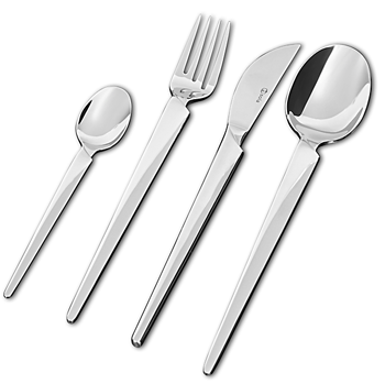 Ruostumatonta terästä, graafinen muotoilu. Lahjapakkaus. Sisältö: 6 kpl kahvilusikka, 6 kpl ruokalusikka, 6 kpl ruokahaarukka, 6 kpl ruokaveitsi.