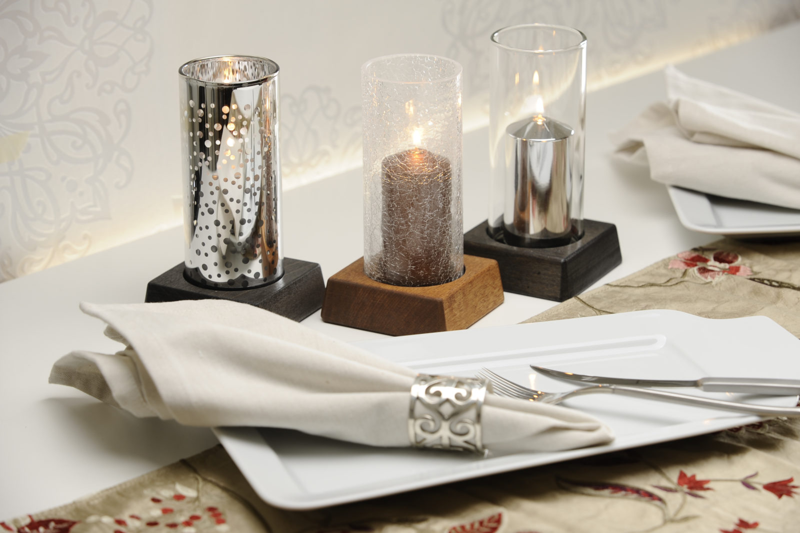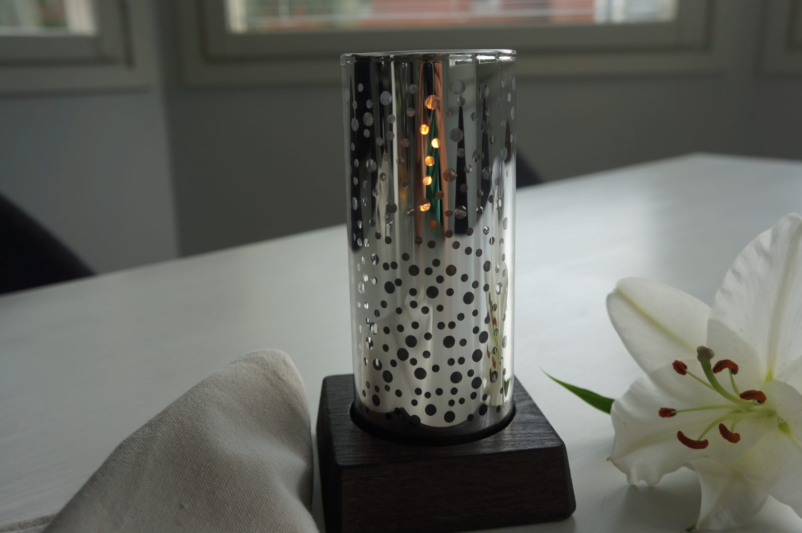 Neliönmallinen alusta mustaa puuta, värisuojus valkoinen, suojalasi upea, kromattu taigapallo. Valo näkyy satumaisesti lyhdyn pallojen läpi! Lyhdyn korkeus 17 cm.