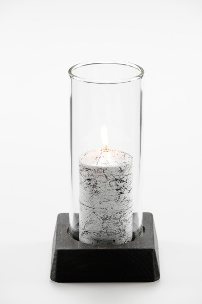 Neliö-alusta mustaa puuta, värisuojus marmoroitu valkoinen, suojalasi sileä. Lyhdyn korkeus 17 cm.