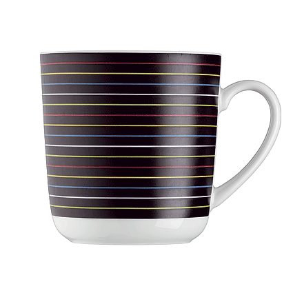 Arzbergin malli FORM 1382. Posliinia. Mustapohjainen, värikkäitä, ohuita raitoja. Yksittäispakattu. Laadukas ja trendikäs malli, itselle ja lahjaksi!